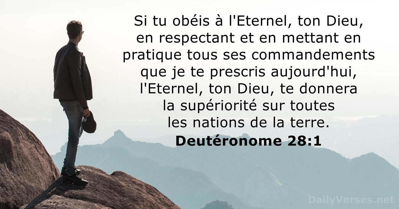 Si tu obéis à l'Eternel, ton Dieu, en respectant et en mettant en pratique tous ses commandements que je te prescris aujourd'hui, l'Eternel, ton Dieu, te donnera la supériorité sur toutes les nations de la terre.