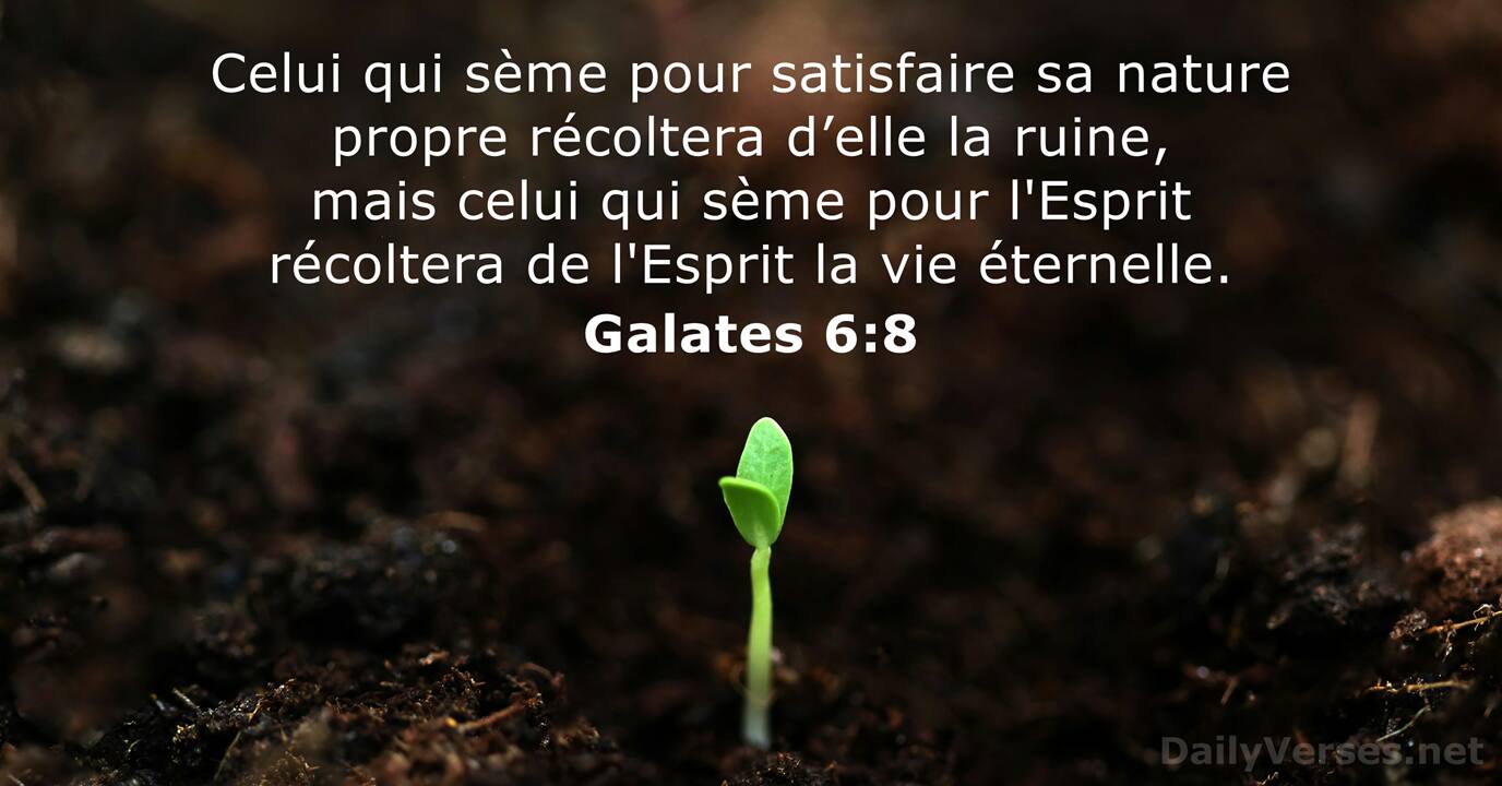 Celui qui sème pour satisfaire sa nature propre récoltera d’elle la ruine, mais celui qui sème pour l'Esprit récoltera de l'Esprit la vie éternelle.
