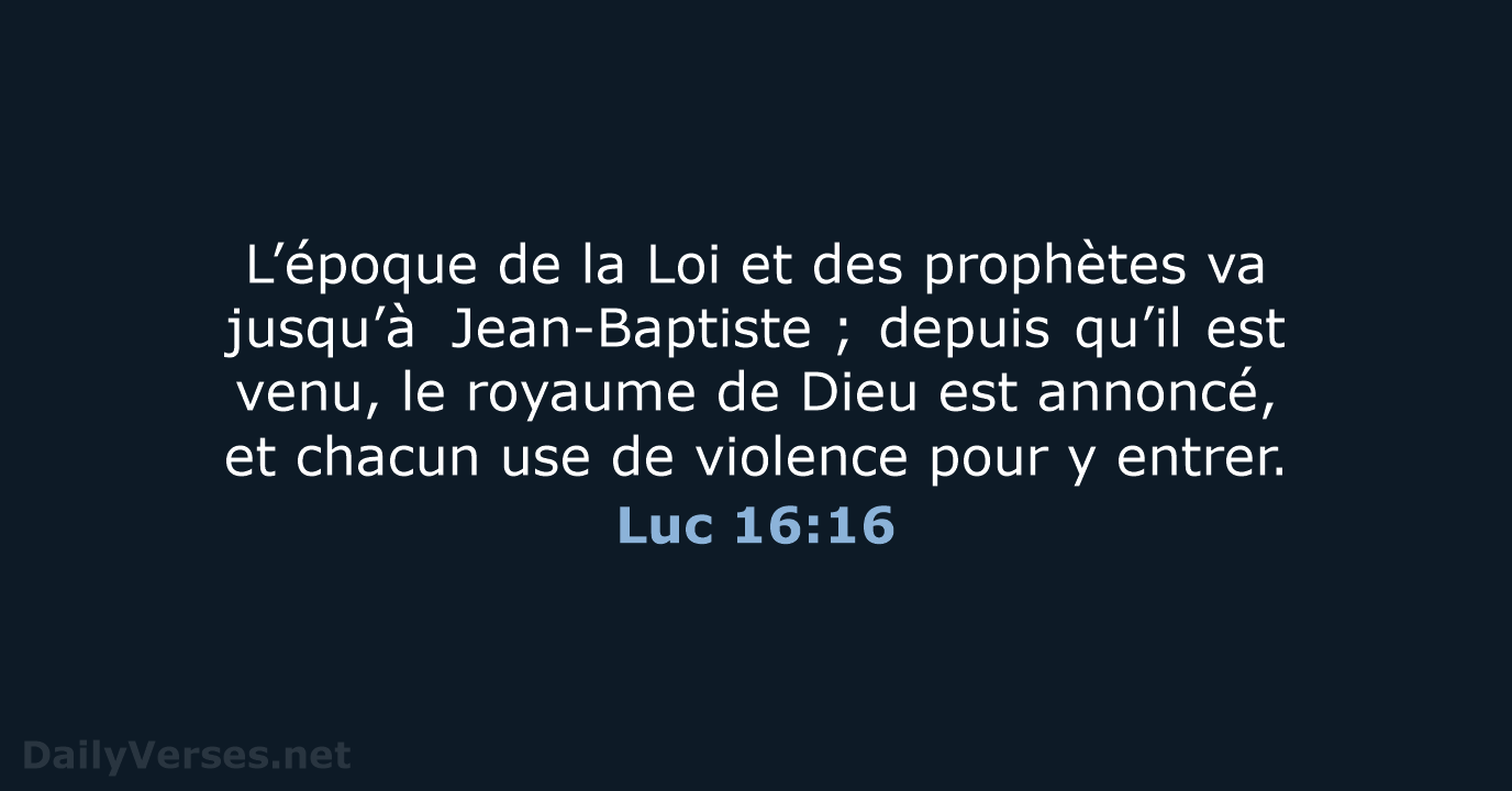- L’époque de la Loi et des prophètes va jusqu’à Jean-Baptiste ; depuis qu’il est venu, le royaume de Dieu est annoncé, et chacun use de violence pour y entrer.