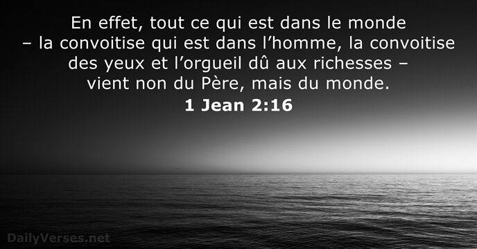 - En effet, tout ce qui est dans le monde – la convoitise qui est dans l’homme, la convoitise des yeux et l’orgueil dû aux richesses – vient non du Père, mais du monde.