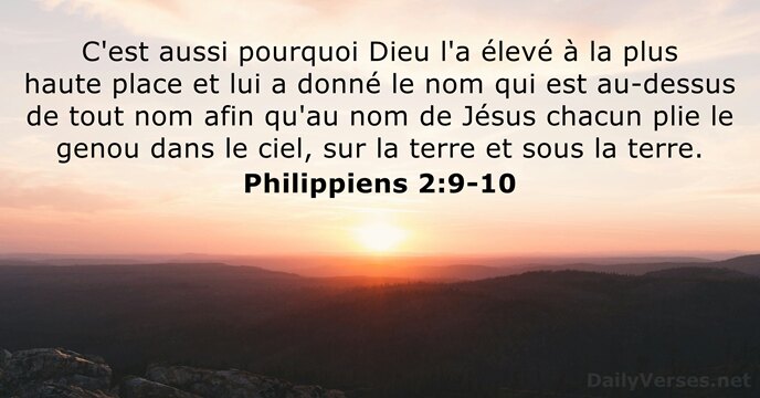 - C'est aussi pourquoi Dieu l'a élevé à la plus haute place et lui a donné le nom qui est au-dessus de tout nom afin qu'au nom de Jésus chacun plie le genou dans le ciel, sur la terre et sous la terre.