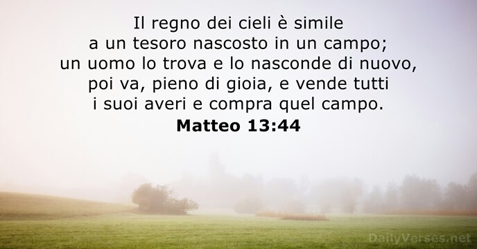 Il regno dei cieli è simile a un tesoro nascosto in un campo; un uomo lo trova e lo nasconde di nuovo, poi va, pieno di gioia, e vende tutti i suoi averi e compra quel campo.