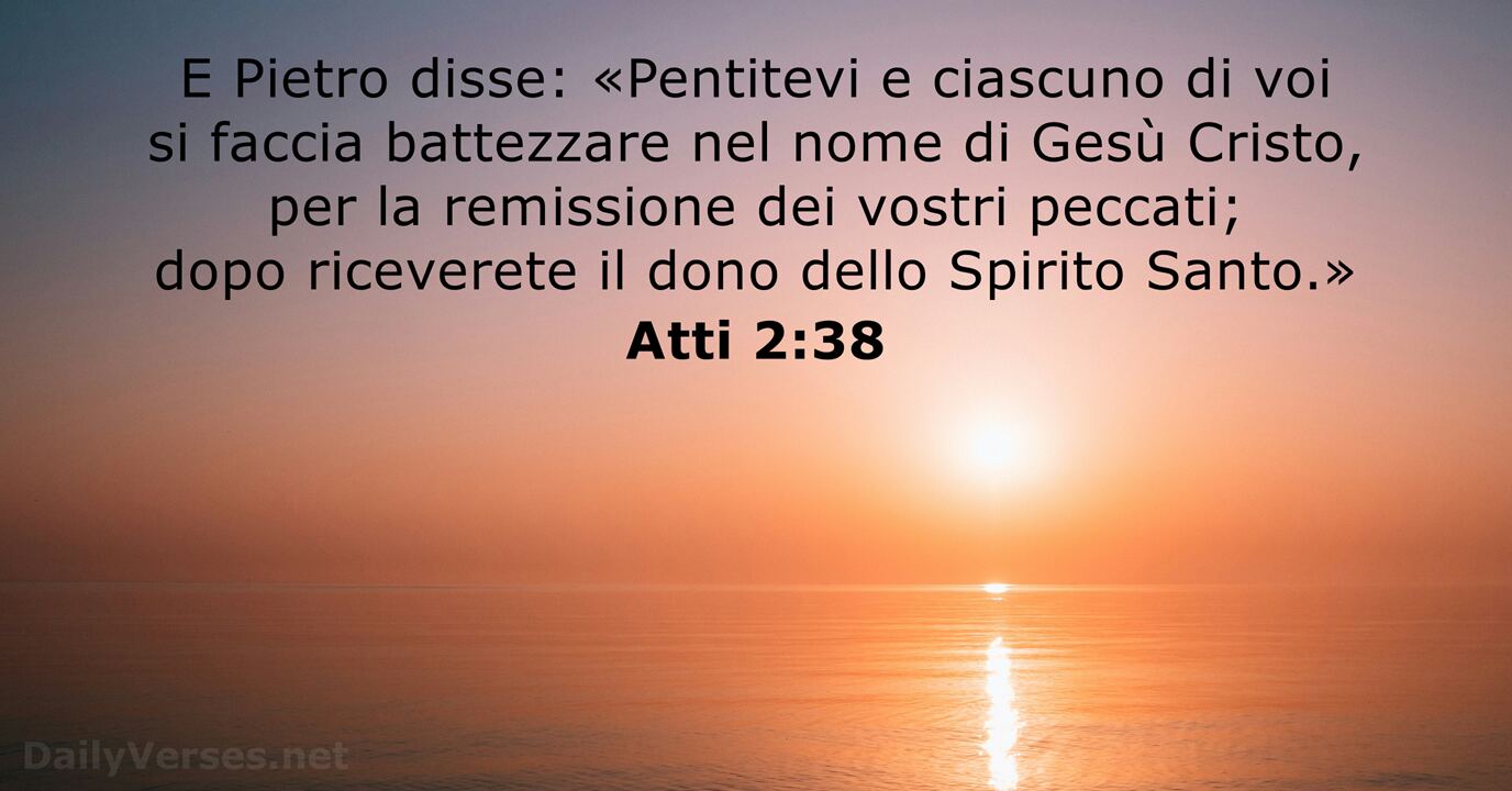 E Pietro disse: «Pentitevi e ciascuno di voi si faccia battezzare nel nome di Gesù Cristo, per la remissione dei vostri peccati; dopo riceverete il dono dello Spirito Santo.»