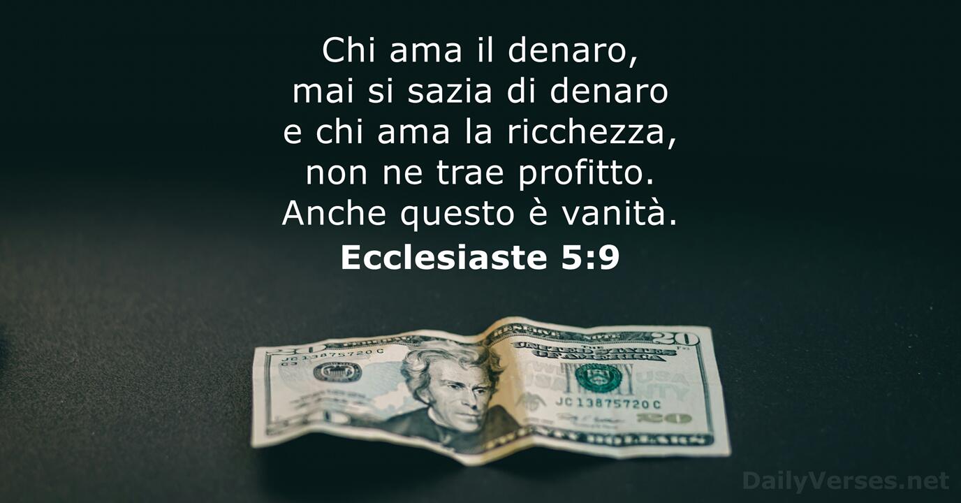 Chi ama il denaro, mai si sazia di denaro e chi ama la ricchezza, non ne trae profitto. Anche questo è vanità.