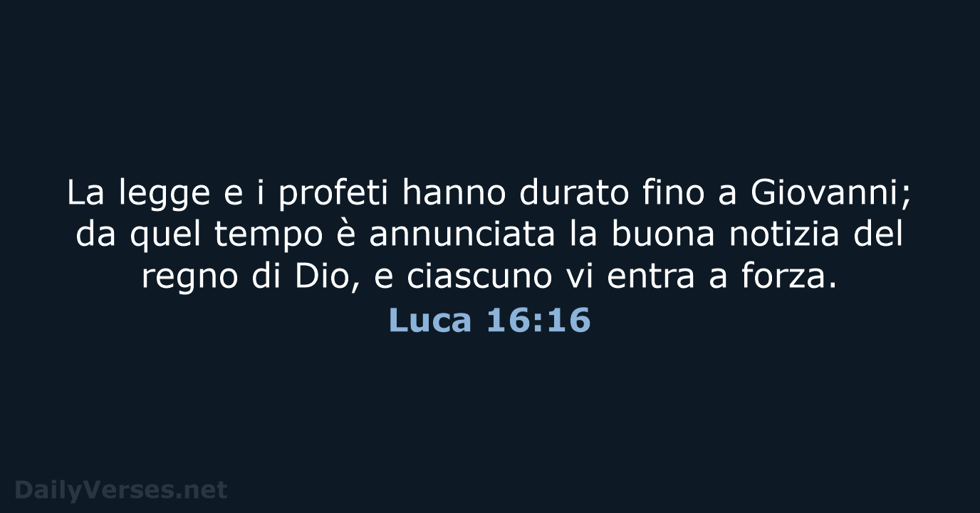 - La legge e i profeti hanno durato fino a Giovanni; da quel tempo è annunciata la buona notizia del regno di Dio, e ciascuno vi entra a forza.