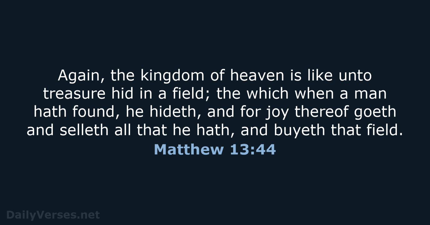 The kingdom of heaven is like a treasure hidden in the field, which a man found and hid again; and from joy over it he goes and sells everything that he has, and buys that field.
