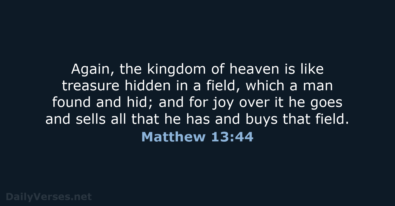 The kingdom of heaven is like a treasure hidden in the field, which a man found and hid again; and from joy over it he goes and sells everything that he has, and buys that field.