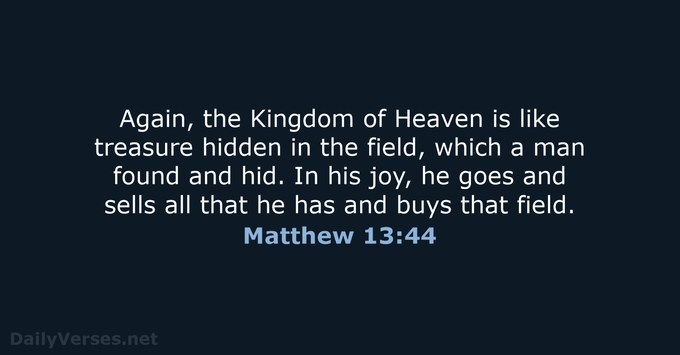 The kingdom of heaven is like a treasure hidden in the field, which a man found and hid again; and from joy over it he goes and sells everything that he has, and buys that field.