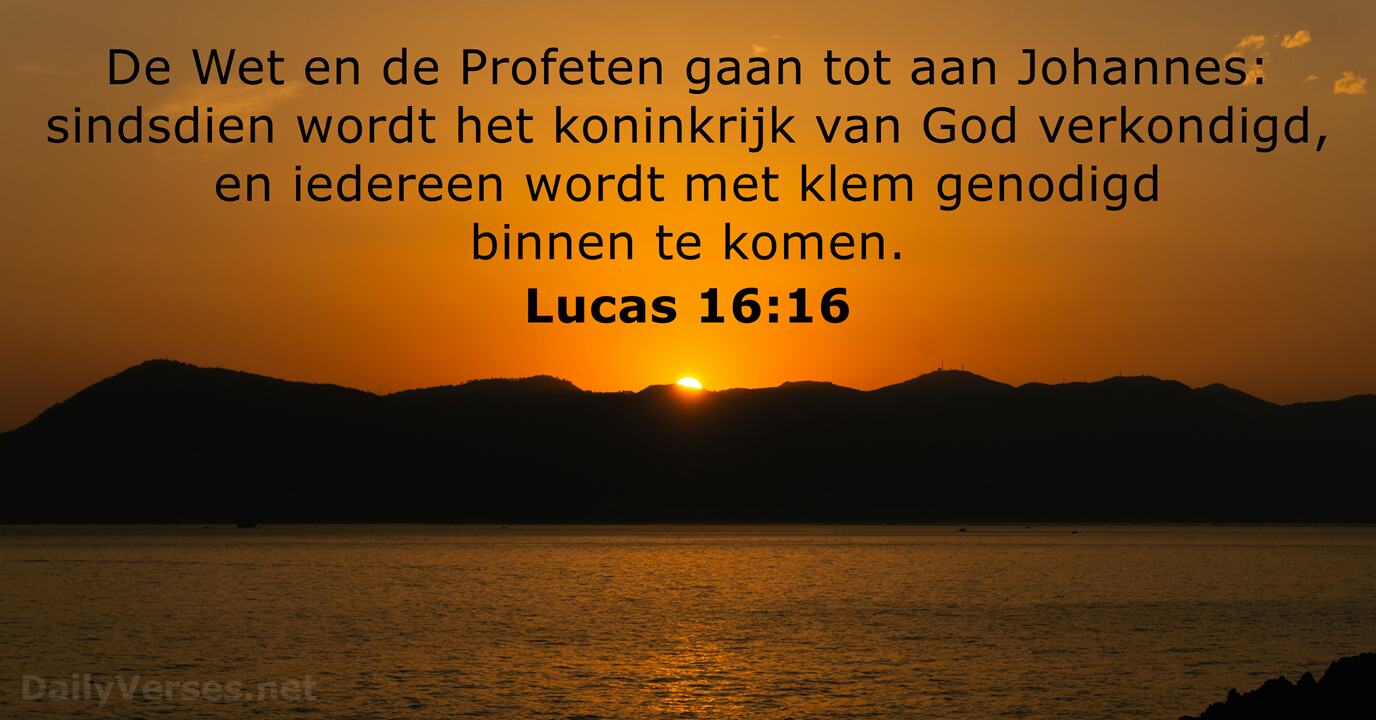 Jezus zei verder: ‘Eerst waren er alleen de heilige boeken van Mozes en de profeten. Toen kwam Johannes de Doper. Sinds dat moment wordt er verteld over Gods nieuwe wereld. En tegen iedereen wordt gezegd: ‘Je moet Gods nieuwe wereld binnengaan!’’