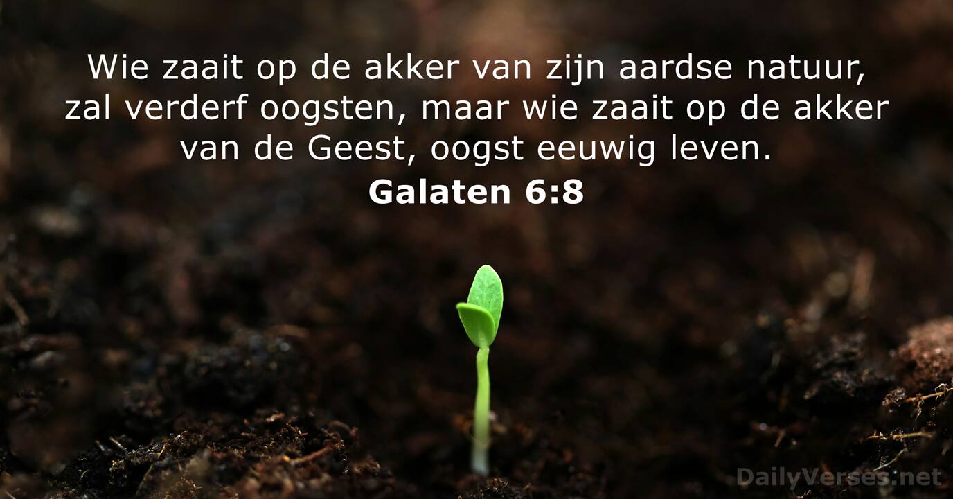 Wie zaait op de akker van zijn aardse natuur, zal verderf oogsten, maar wie zaait op de akker van de Geest, oogst eeuwig leven.