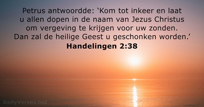 En Petrus antwoordde hun: Bekeert u en een ieder van u late zich dopen op de naam van Jezus Christus, tot vergeving van uw zonden, en gij zult de gave des heiligen Geestes ontvangen.