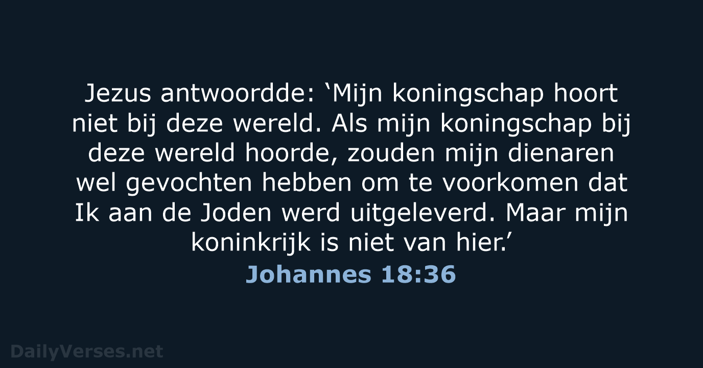 Jezus antwoordde: Mijn Koninkrijk is niet van deze wereld. Als Mijn Koninkrijk van deze wereld was, zouden Mijn dienaars gestreden hebben, opdat Ik niet aan de Joden overgeleverd zou worden, maar nu is Mijn Koninkrijk niet van hier.