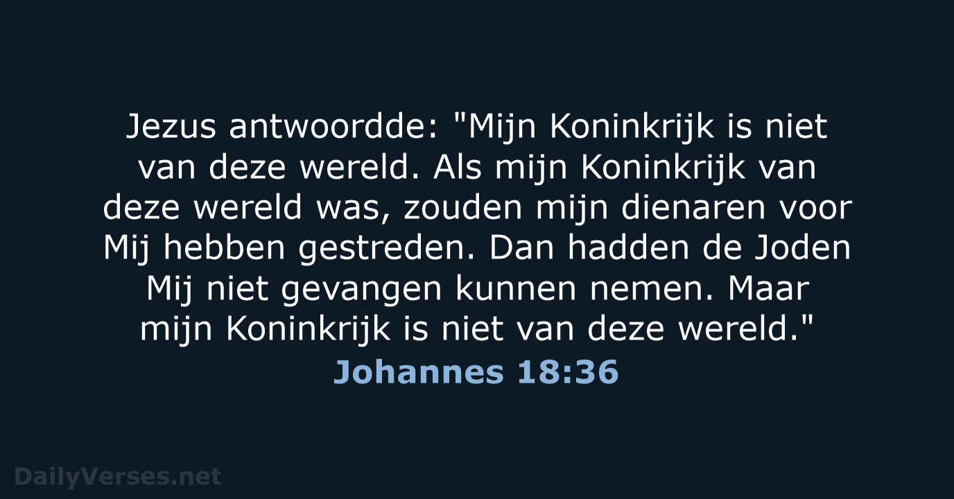 Jezus antwoordde: Mijn Koninkrijk is niet van deze wereld. Als Mijn Koninkrijk van deze wereld was, zouden Mijn dienaars gestreden hebben, opdat Ik niet aan de Joden overgeleverd zou worden, maar nu is Mijn Koninkrijk niet van hier.