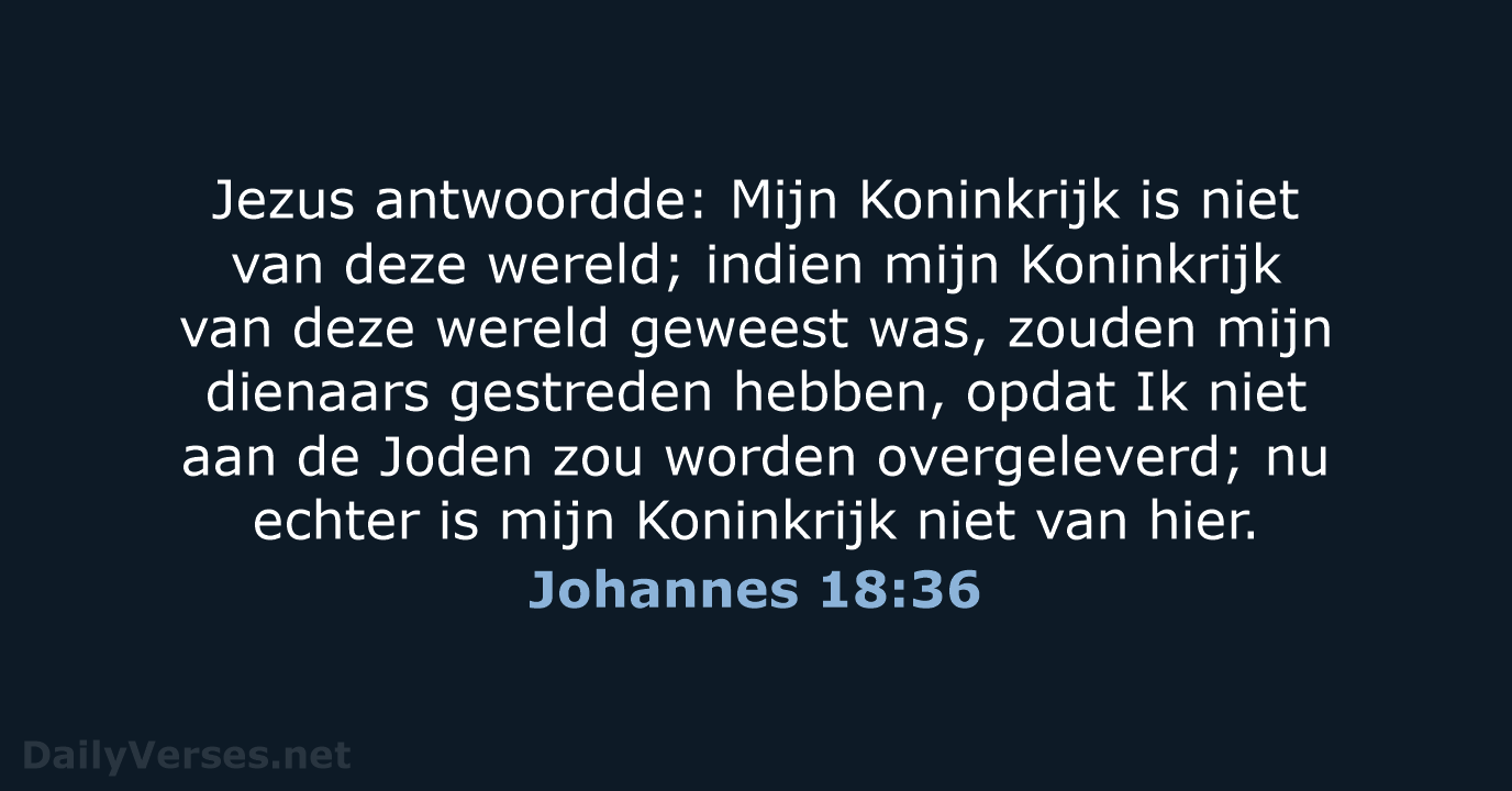 Jezus antwoordde: Mijn Koninkrijk is niet van deze wereld. Als Mijn Koninkrijk van deze wereld was, zouden Mijn dienaars gestreden hebben, opdat Ik niet aan de Joden overgeleverd zou worden, maar nu is Mijn Koninkrijk niet van hier.