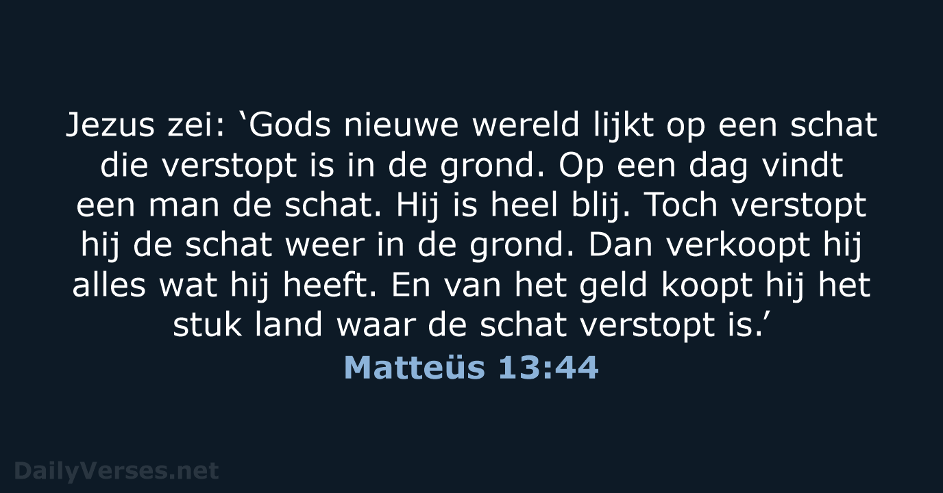 Het is met het koninkrijk van de hemel als met een schat die verborgen lag in een akker. Iemand vond hem en verborg hem opnieuw, en in zijn vreugde verkocht hij alles wat hij had en kocht die akker.