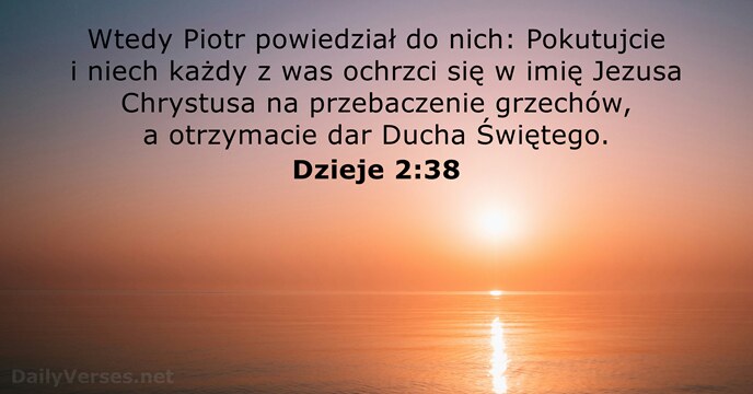 A Piotr do nich: Upamiętajcie się i niechaj się każdy z was da ochrzcić w imię Jezusa Chrystusa na odpuszczenie grzechów waszych, a otrzymacie dar Ducha Świętego.