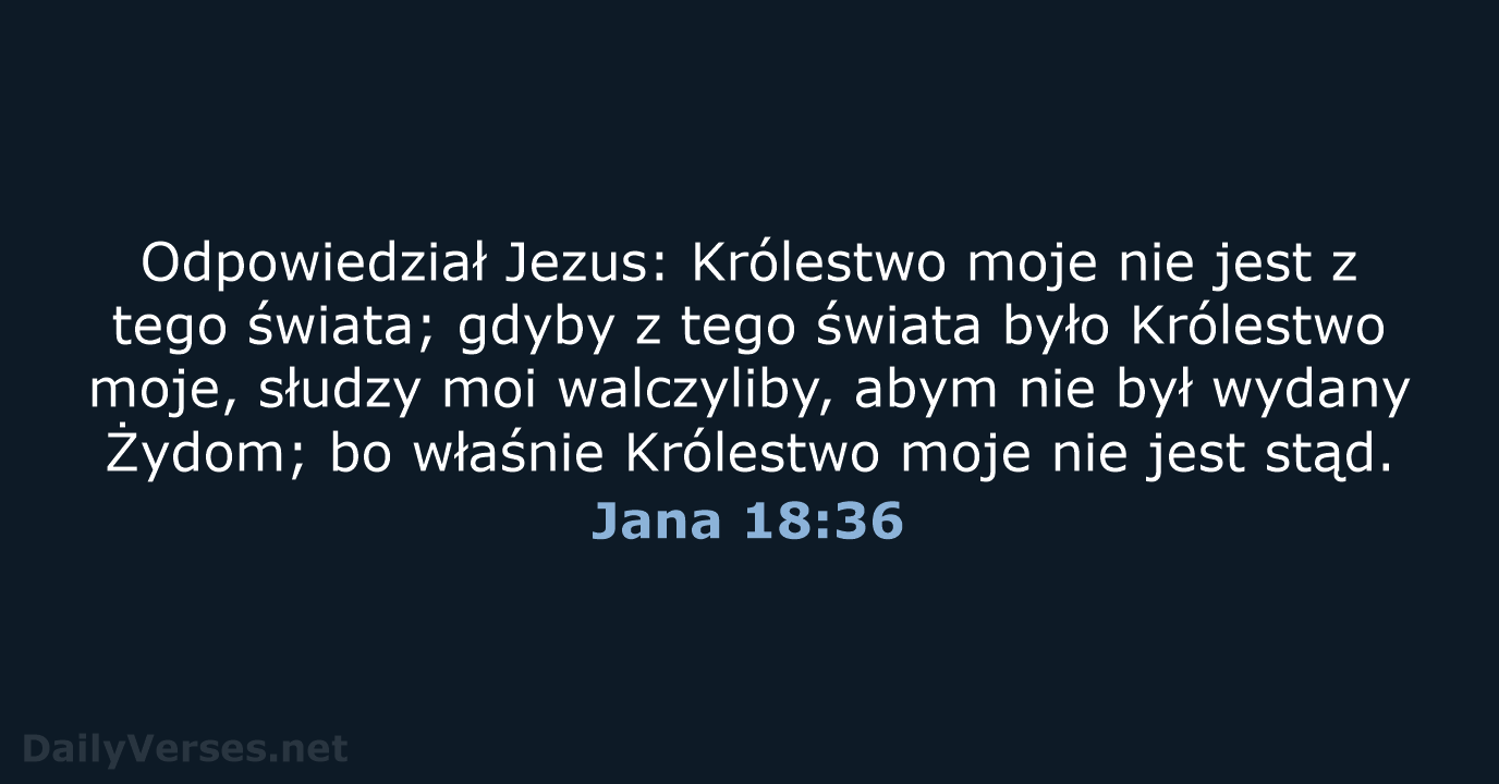 Odpowiedział Jezus: Królestwo moje nie jest z tego świata; gdyby z tego świata było Królestwo moje, słudzy moi walczyliby, abym nie był wydany Żydom; bo właśnie Królestwo moje nie jest stąd.