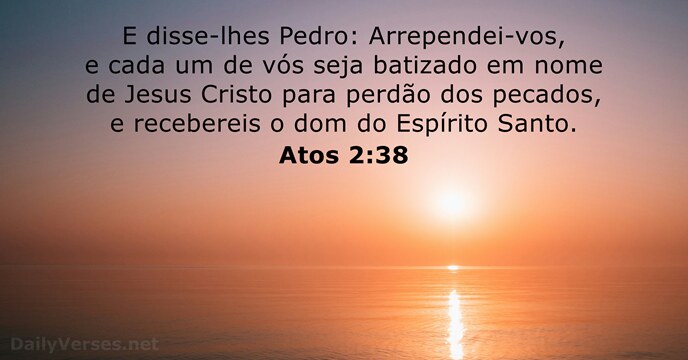 Respondeu-lhes Pedro: Arrependei-vos, e cada um de vós seja batizado em nome de Jesus Cristo para remissão dos vossos pecados, e recebereis o dom do Espírito Santo.