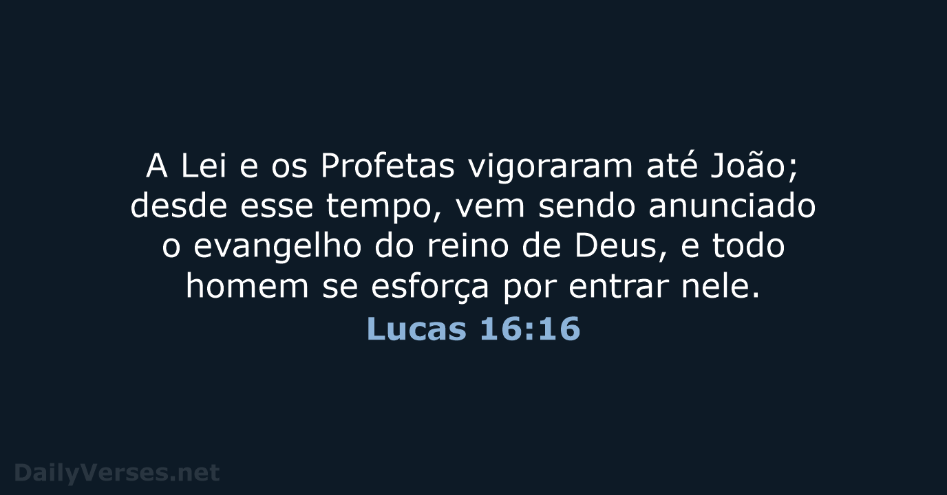 - A Lei e os Profetas vigoraram até João; desde esse tempo, vem sendo anunciado o evangelho do reino de Deus, e todo homem se esforça por entrar nele.