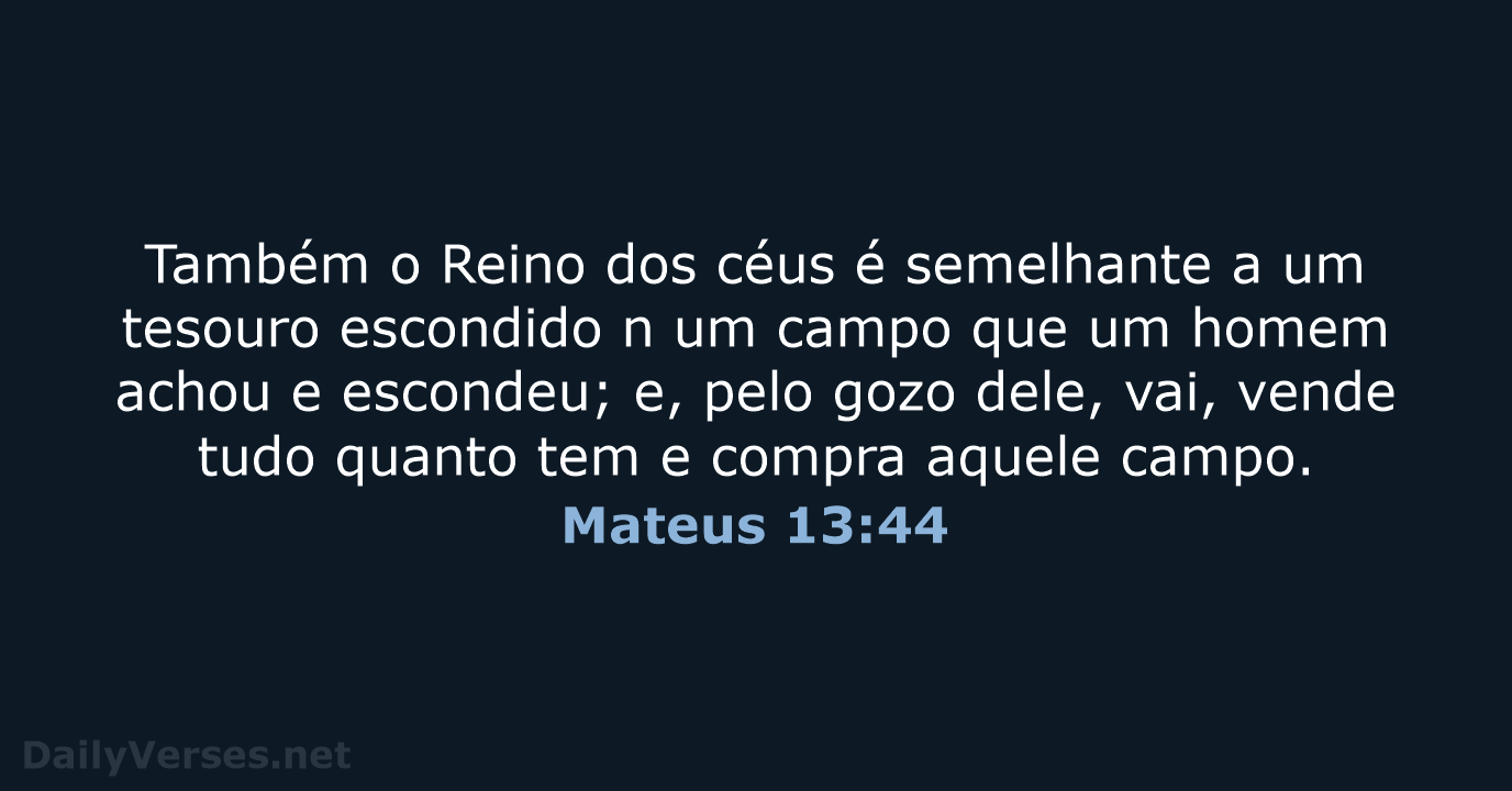 Também o Reino dos céus é semelhante a um tesouro escondido n um campo que um homem achou e escondeu; e, pelo gozo dele, vai, vende tudo quanto tem e compra aquele campo.
