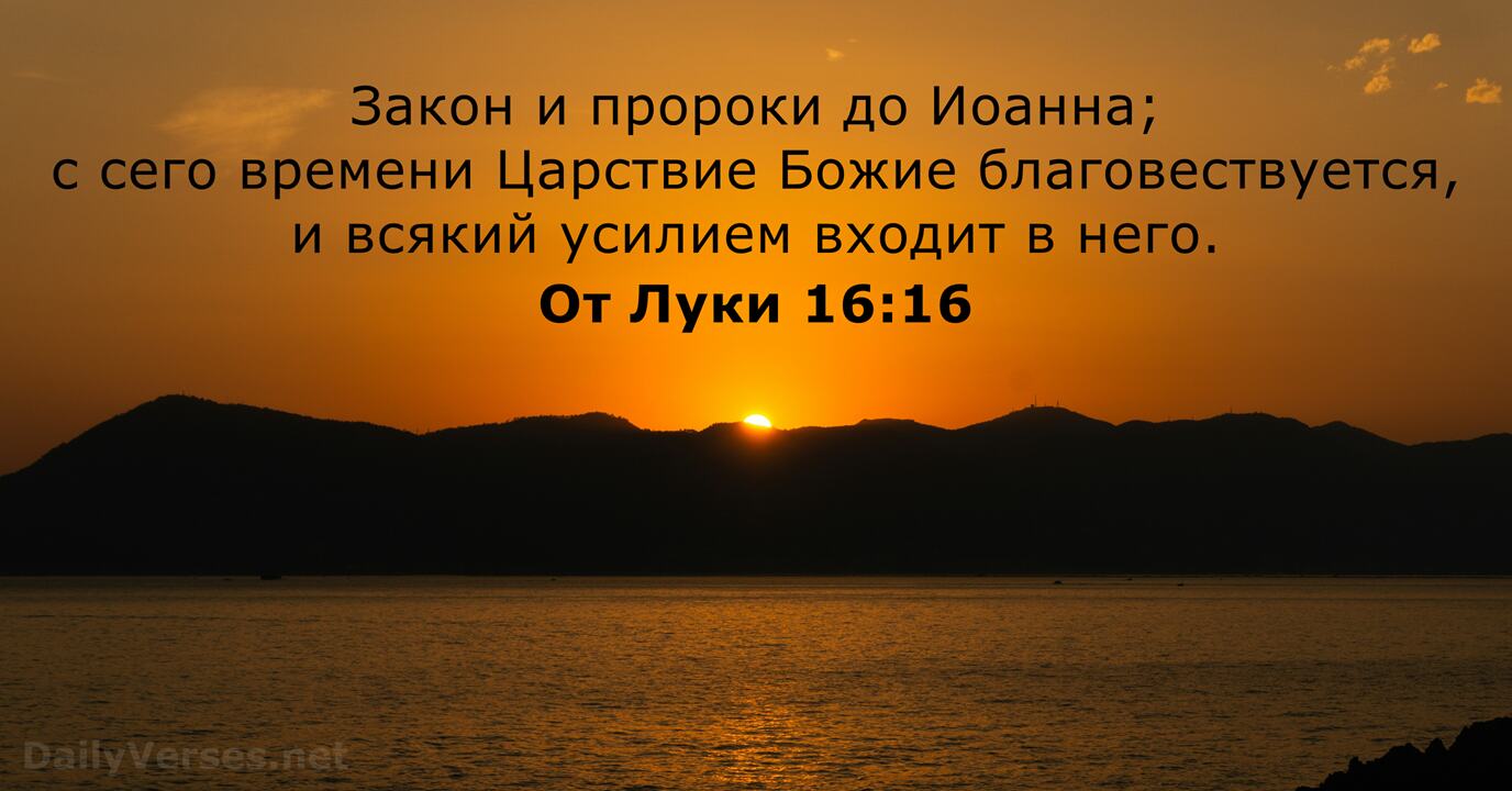 Закон и пророки до Иоанна; с сего времени Царствие Божие благовествуется, и всякий усилием входит в него.