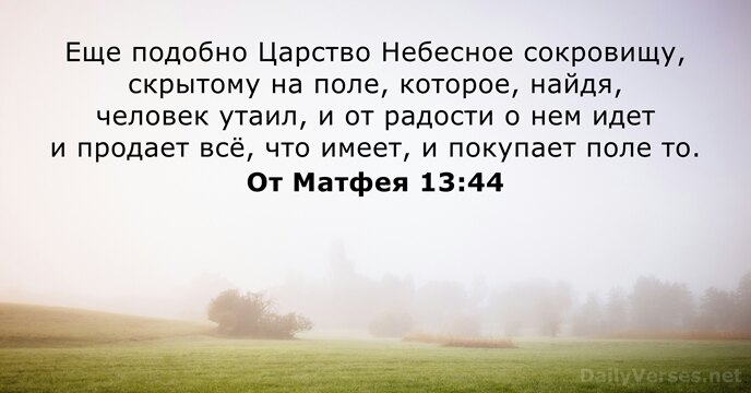 Еще подобно Царство Небесное сокровищу, скрытому на поле, которое, найдя, человек утаил, и от радости о нем идет и продает всё, что имеет, и покупает поле то.