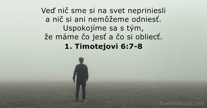 Veď nič sme si na svet nepriniesli a nič si ani nemôžeme odniesť. Uspokojíme sa s tým, že máme čo jesť a čo si obliecť.