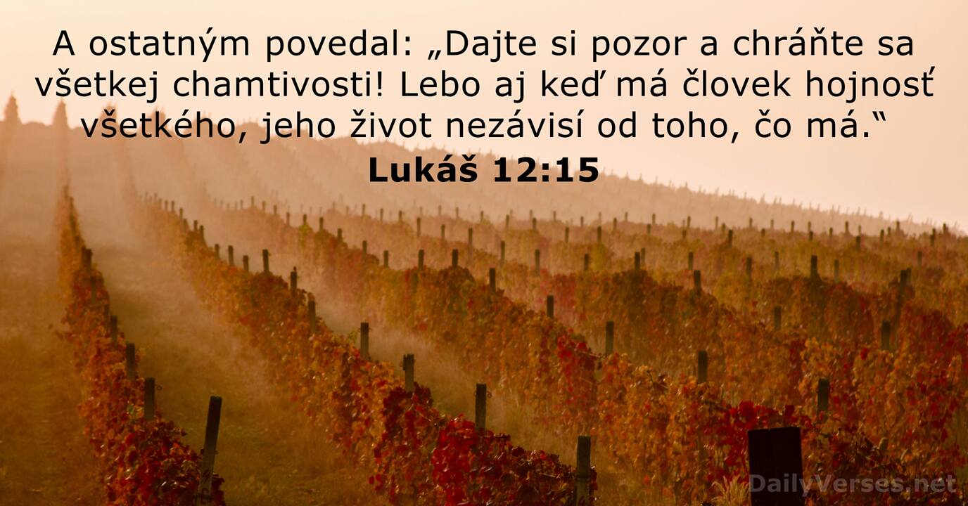 A ostatným povedal: „Dajte si pozor a chráňte sa všetkej chamtivosti! Lebo aj keď má človek hojnosť všetkého, jeho život nezávisí od toho, čo má.“