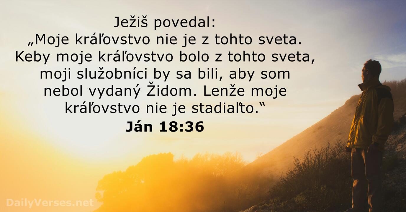 Ježiš povedal: „Moje kráľovstvo nie je z tohto sveta. Keby moje kráľovstvo bolo z tohto sveta, moji služobníci by sa bili, aby som nebol vydaný Židom. Lenže moje kráľovstvo nie je stadiaľto.“