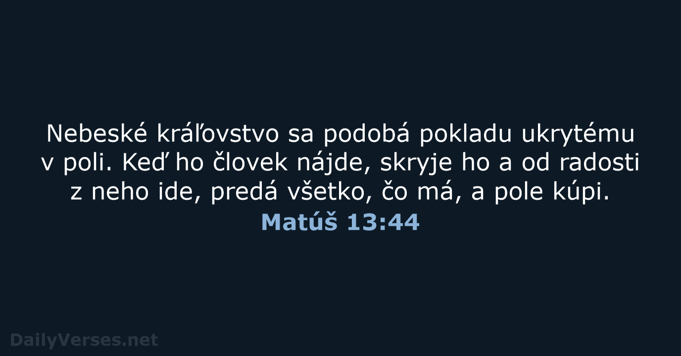 Nebeské kráľovstvo sa podobá pokladu ukrytému v poli. Keď ho človek nájde, skryje ho a od radosti z neho ide, predá všetko, čo má, a pole kúpi.