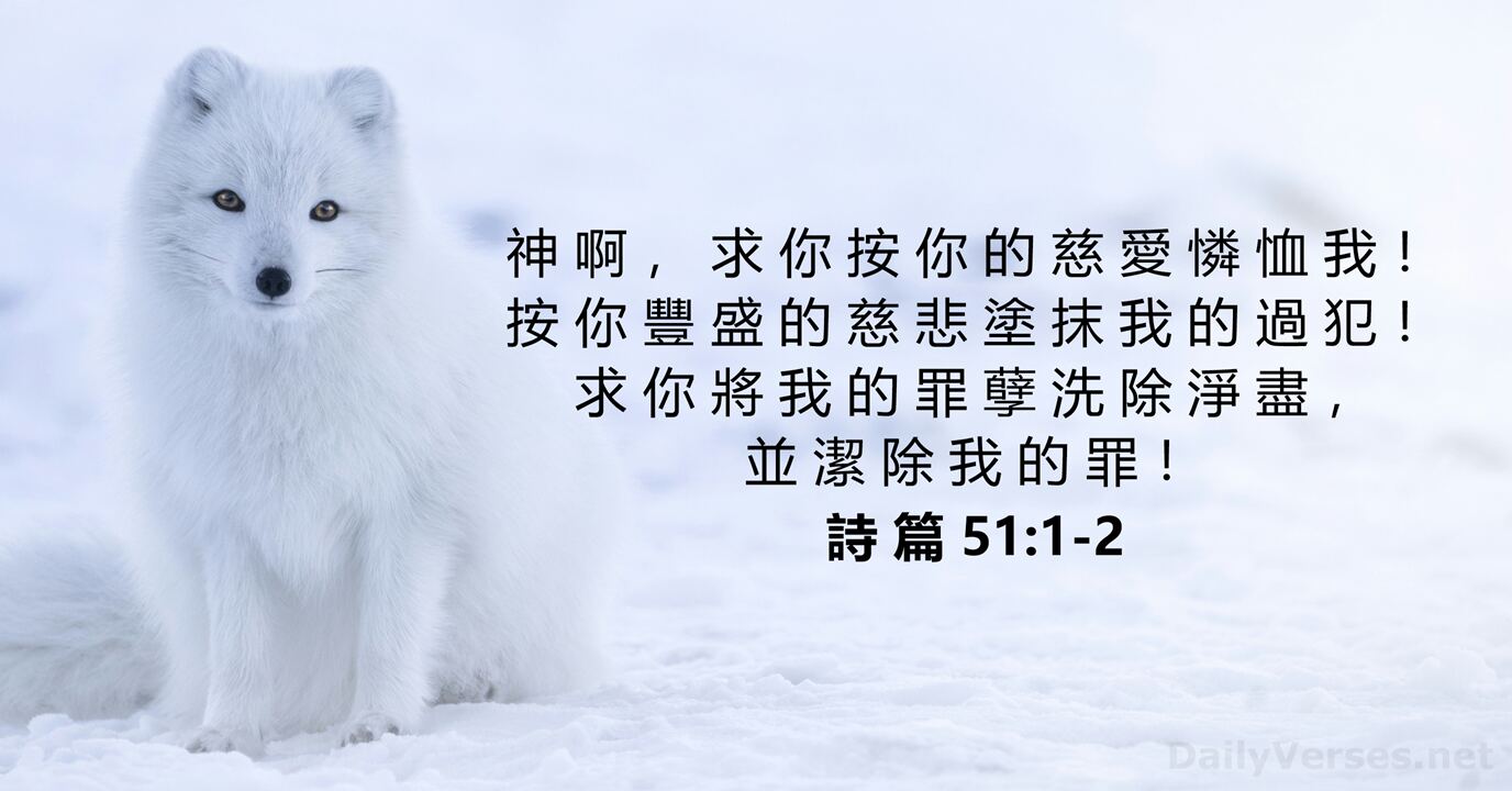 神 啊 , 求 你 按 你 的 慈 愛 憐 恤 我 ! 按 你 豐 盛 的 慈 悲 塗 抹 我 的 過 犯 ! 求 你 將 我 的 罪 孽 洗 除 淨 盡 , 並 潔 除 我 的 罪 !