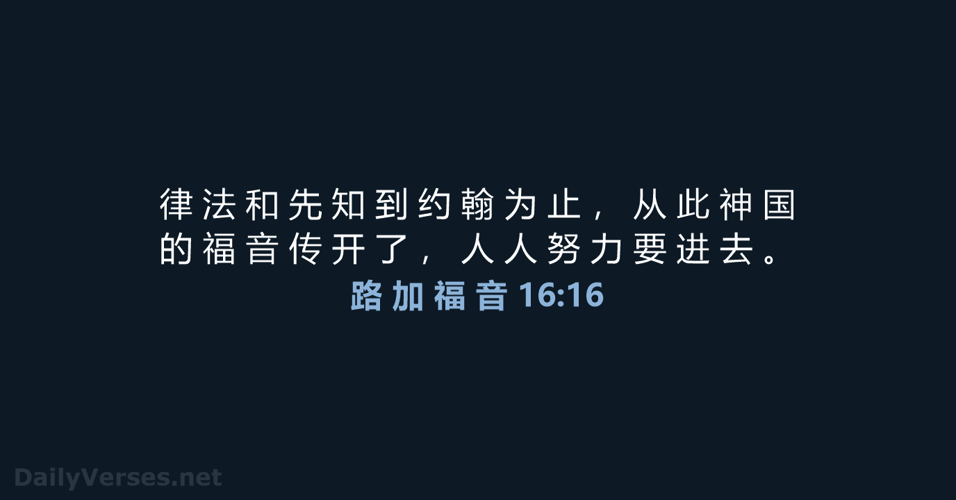 律 法 和 先 知 到 约 翰 为 止 , 从 此 神 国 的 福 音 传 开 了 , 人 人 努 力 要 进 去 。