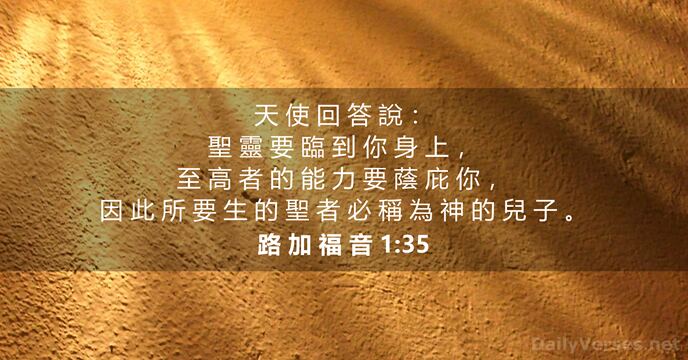 天 使 回 答 說 : 聖 靈 要 臨 到 你 身 上 , 至 高 者 的 能 力 要 蔭 庇 你 , 因 此 所 要 生 的 聖 者 必 稱 為 神 的 兒 子 。