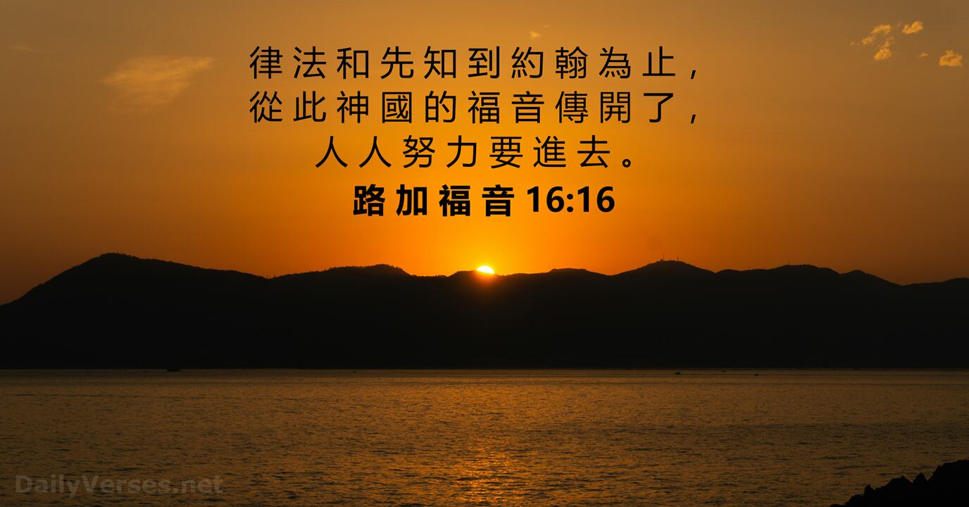 律 法 和 先 知 到 約 翰 為 止 , 從 此 神 國 的 福 音 傳 開 了 , 人 人 努 力 要 進 去 。