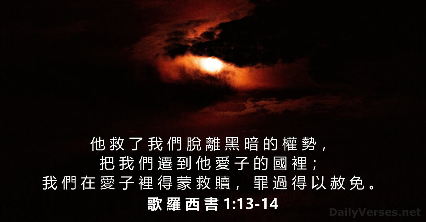 他 救 了 我 們 脫 離 黑 暗 的 權 勢 , 把 我 們 遷 到 他 愛 子 的 國 裡 ; 我 們 在 愛 子 裡 得 蒙 救 贖 , 罪 過 得 以 赦 免 。