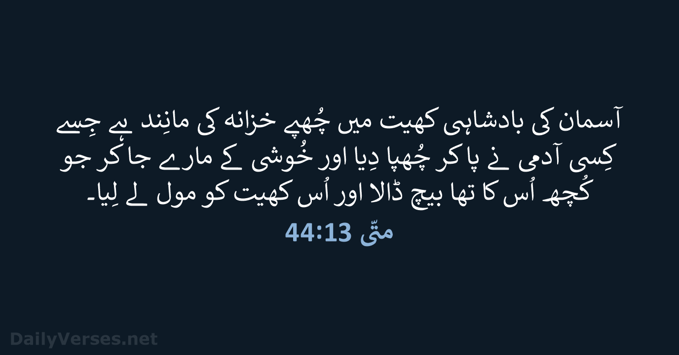آسمان کی بادشاہی کھیت میں چُھپے خزانہ کی مانِند ہے جِسے کِسی آدمی نے پا کر چُھپا دِیا اور خُوشی کے مارے جا کر جو کُچھ اُس کا تھا بیچ ڈالا اور اُس کھیت کو مول لے لِیا۔