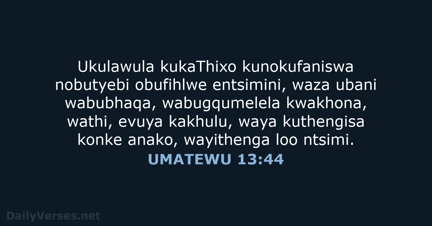 Ukulawula kukaThixo kunokufaniswa nobutyebi obufihlwe entsimini, waza ubani wabubhaqa, wabugqumelela kwakhona, wathi, evuya kakhulu, waya kuthengisa konke anako, wayithenga loo ntsimi.