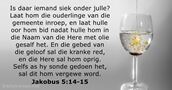 en Hy verbind hulle wonde. - Is daar iemand siek onder julle? Laat hom die ouderlinge van die gemeente inroep, en laat hulle oor hom bid nadat hulle hom in die Naam van die Here met olie gesalf het. En die gebed van die geloof sal die kranke red, en die Here sal hom oprig. Selfs as hy sonde gedoen het, sal dit hom vergewe word.