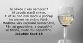 jejich rány obvazuje. - Je někdo z vás nemocen? Ať zavolá starší církve, ti ať se nad ním modlí a potírají ho olejem ve jménu Páně. Modlitba víry zachrání nemocného, Pán jej pozdvihne, a dopustil-li se hříchů, bude mu odpuštěno.