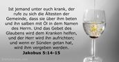 und verbindet ihre Wunden. - Ist jemand unter euch krank, der rufe zu sich die Ältesten der Gemeinde, dass sie über ihm beten und ihn salben mit Öl in dem Namen des Herrn. Und das Gebet des Glaubens wird dem Kranken helfen, und der Herr wird ihn aufrichten; und wenn er Sünden getan hat, wird ihm vergeben werden.