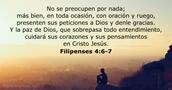 - No se preocupen por nada; más bien, en toda ocasión, con oración y ruego, presenten sus peticiones a Dios y denle gracias. Y la paz de Dios, que sobrepasa todo entendimiento, cuidará sus corazones y sus pensamientos en Cristo Jesús.