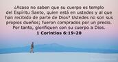 pero el ánimo decaído seca los huesos. - ¿Acaso no saben que su cuerpo es templo del Espíritu Santo, quien está en ustedes y al que han recibido de parte de Dios? Ustedes no son sus propios dueños; fueron comprados por un precio. Por tanto, glorifiquen con su cuerpo a Dios.