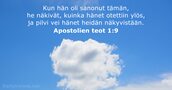 - Ja kun he Jeesuksen etääntyessä vielä tähysivät taivaalle, heidän vieressään seisoi yhtäkkiä kaksi valkopukuista miestä. Nämä sanoivat: »Galilean miehet, mitä te siinä seisotte katselemassa taivaalle? Tämä Jeesus, joka otettiin teidän luotanne taivaaseen, tulee kerran takaisin, samalla tavoin kuin näitte hänen taivaaseen menevän.»