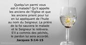 et panse leurs blessures. - Quelqu'un parmi vous est-il malade? Qu'il appelle les anciens de l'Eglise et que les anciens prient pour lui en lui appliquant de l’huile au nom du Seigneur. La prière de la foi sauvera le malade et le Seigneur le relèvera. S'il a commis des péchés, le pardon lui sera accordé.