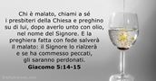 e fascia le loro ferite. - Chi è malato, chiami a sé i presbiteri della Chiesa e preghino su di lui, dopo averlo unto con olio, nel nome del Signore. E la preghiera fatta con fede salverà il malato: il Signore lo rialzerà e se ha commesso peccati, gli saranno perdonati.