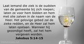 en verzorgt hun diepe wonden. - Laat iemand die ziek is de oudsten van de gemeente bij zich roepen; laten ze voor hem bidden en hem met olie zalven in de naam van de Heer. Het gelovige gebed zal de zieke redden, en de Heer zal hem laten opstaan. Wanneer hij gezondigd heeft, zal het hem vergeven worden.