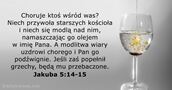 i opatruje ich rany. - Choruje ktoś wśród was? Niech przywoła starszych kościoła i niech się modlą nad nim, namaszczając go olejem w imię Pana. A modlitwa wiary uzdrowi chorego i Pan go podźwignie. Jeśli zaś popełnił grzechy, będą mu przebaczone.