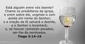 e liga-lhes as feridas. - Está alguém entre vós doente? Chame os presbíteros da igreja, e orem sobre ele, ungindo-o com azeite em nome do Senhor; e a oração da fé salvará o doente, e o Senhor o levantará; e, se houver cometido pecados, ser-lhe-ão perdoados.